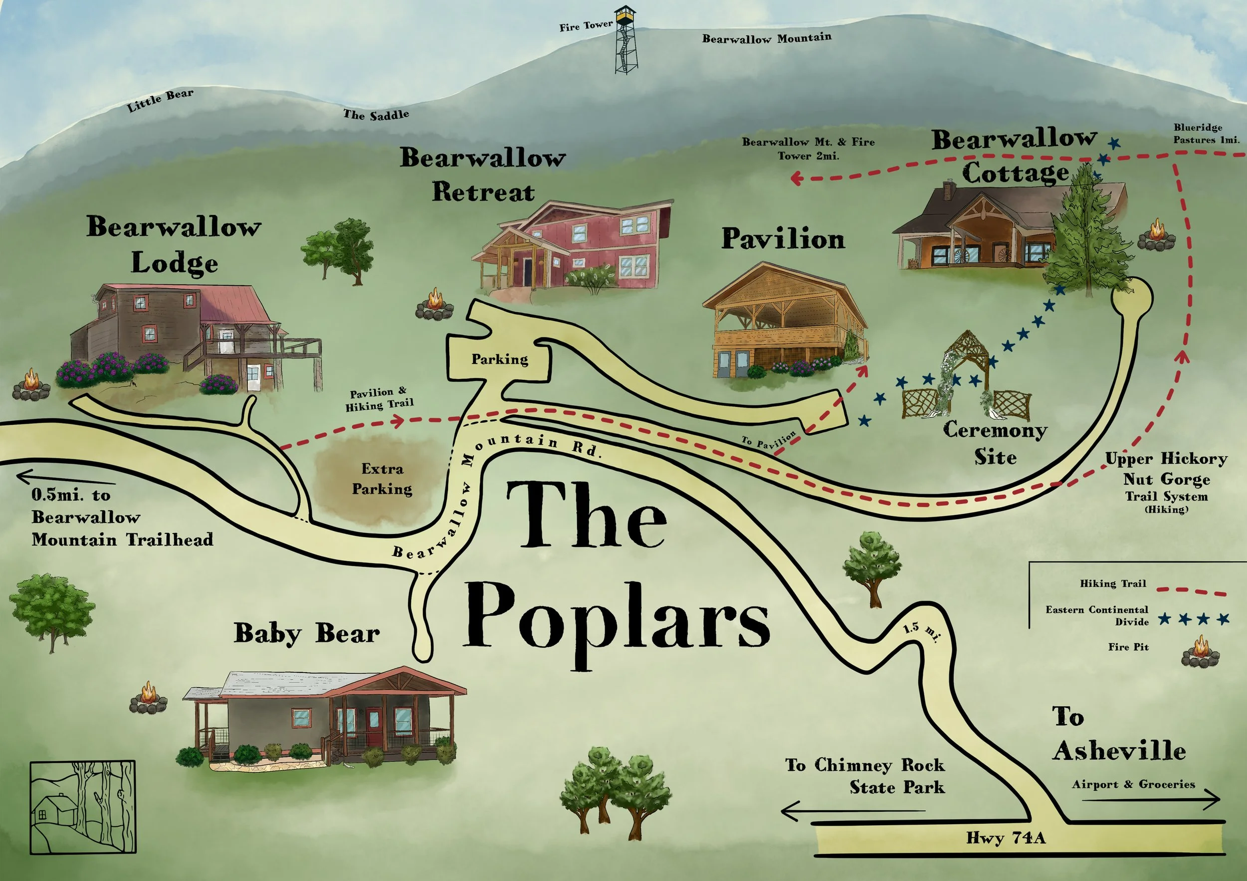 Three night minimum stay at each of the four homes on the property are required for booking an event (Bearwallow Retreat, Bearwallow Lodge, Baby Bear, and Bearwallow Cottage).